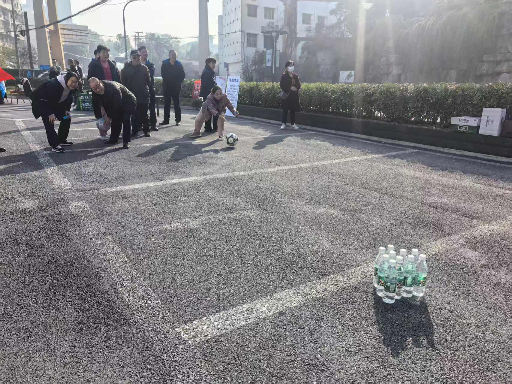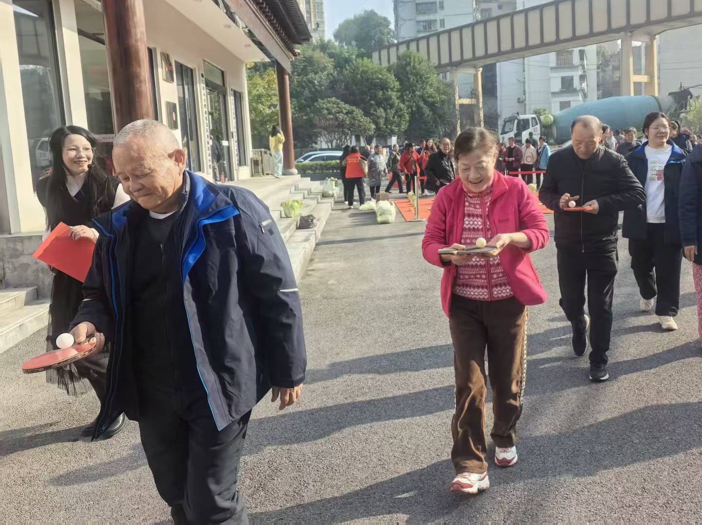 趣味保龄球项目中,老人们瞄准塑料瓶阵滚球,击倒瓶子时的欢呼声此起彼伏;欢乐套圈前,大家瞄准蔬菜、油盐酱醋等生活物资投掷,有人接连套中奖品,开心得像个孩子;球拍托球健步走环节,老人们小心翼翼托球前行,现场满是欢声笑语。
