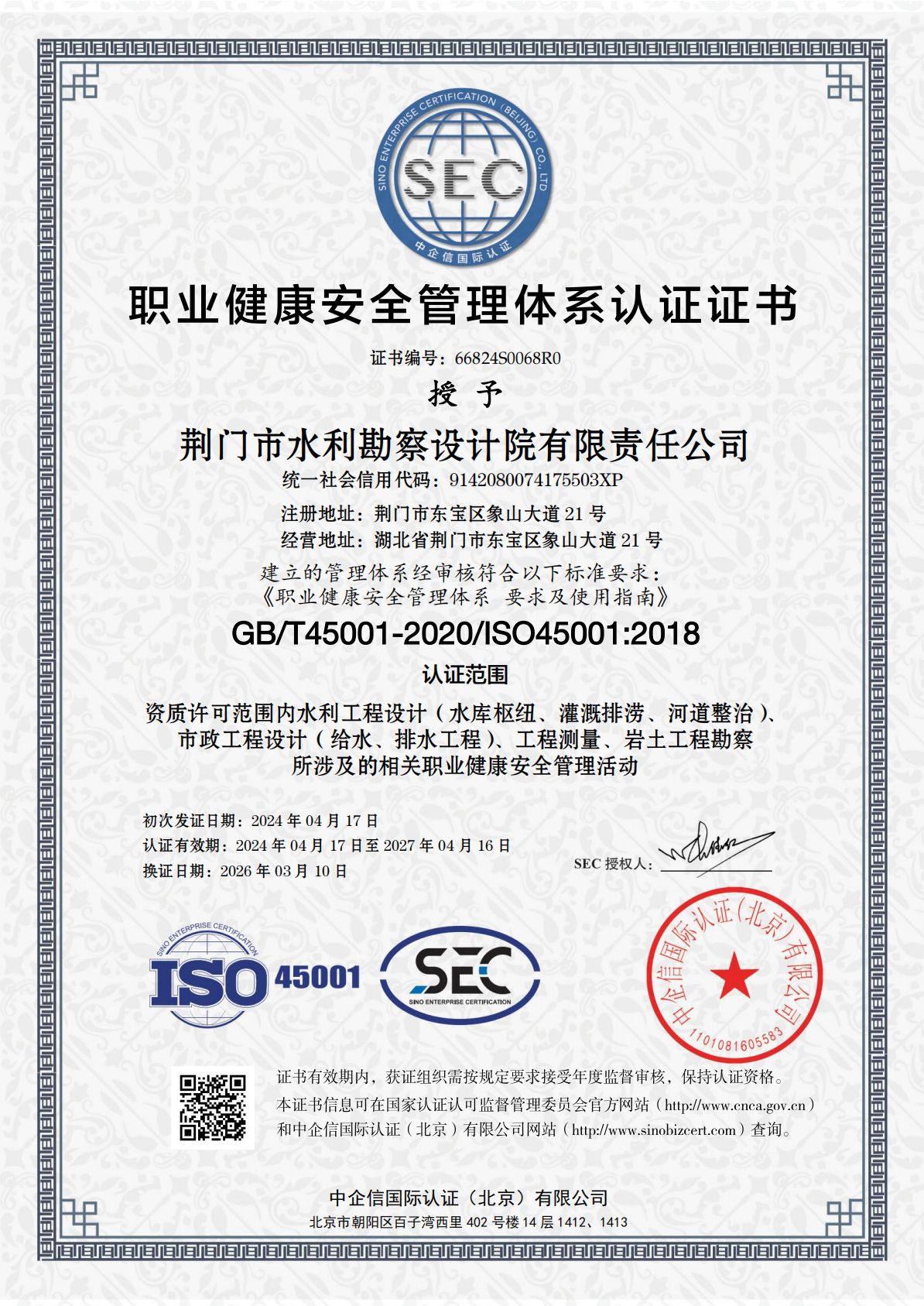 近日,市水务集团下属子公司荆门市水利勘察设计院有限责任公司(以下简称“水勘院”)顺利通过QES(质量、环境及职业健康安全)三体系再认证审核,并新增市政工程设计(给水、排水工程)认证范围,这标志着水勘院从水利工程向市政水务工程领域迈出了实质性的一步。